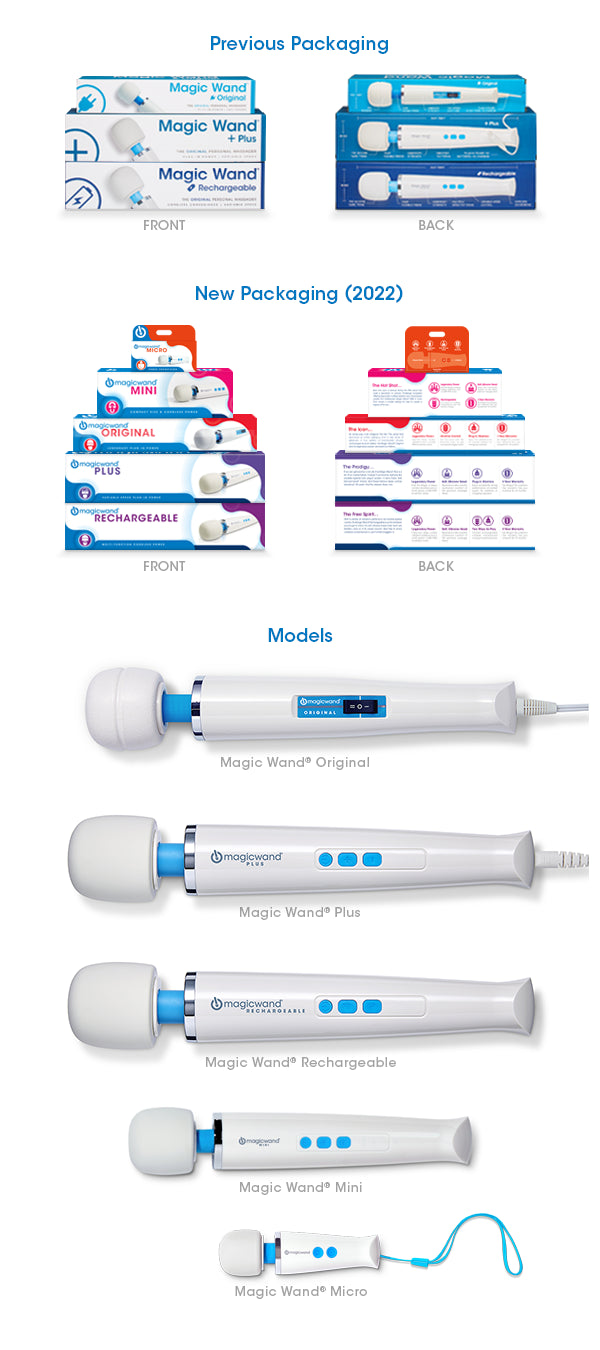 A way to determine the authenticity of a Magic Wand massager is to look for certain features that are unique to the authentic product. Authentic Magic Wands will always have the Magic Wand logo and the circle ® mark indicating the brand’s registered trademark. Counterfeit products may have slight variations in design and may not have the same level of attention to detail as an authentic product. Authentic Magic Wands always have a white handle and body, blue neck, and white head. See additional photos pictured on right for details from each model.